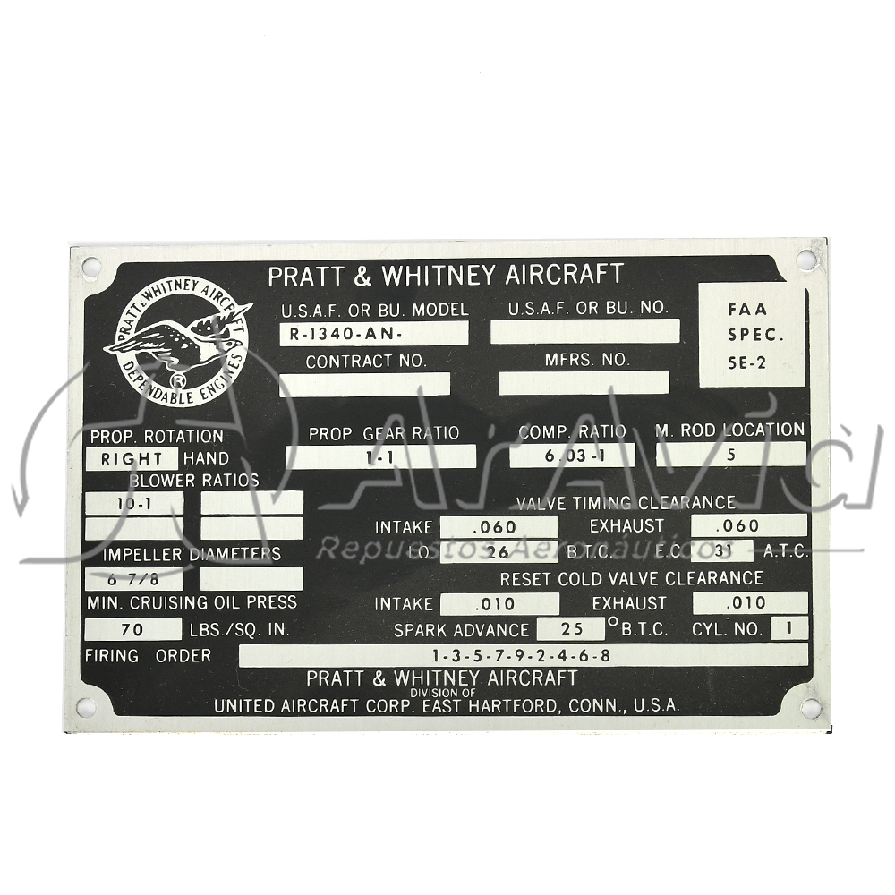 Pratt and Whitney Placa de Identificación R1340