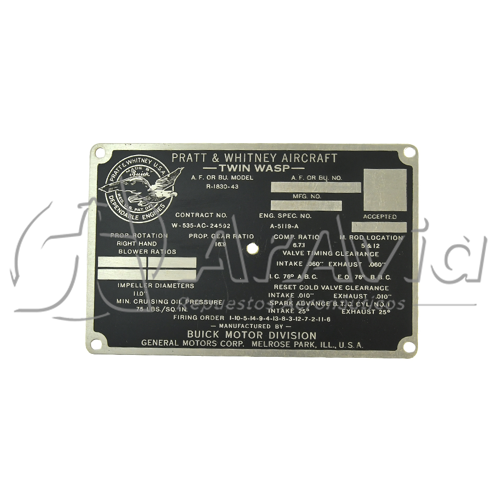 Pratt and Whitney Placa de Identificación R1830